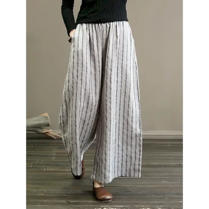 Women’s Wide Leg Chinos Pants Trousers Vintage Fashion Lightweight Full Length Mid Waist Striped Pocket Elastic Waist Baggy Breathability Comfortable Micro-elastic Vacation Casual Daily Black White