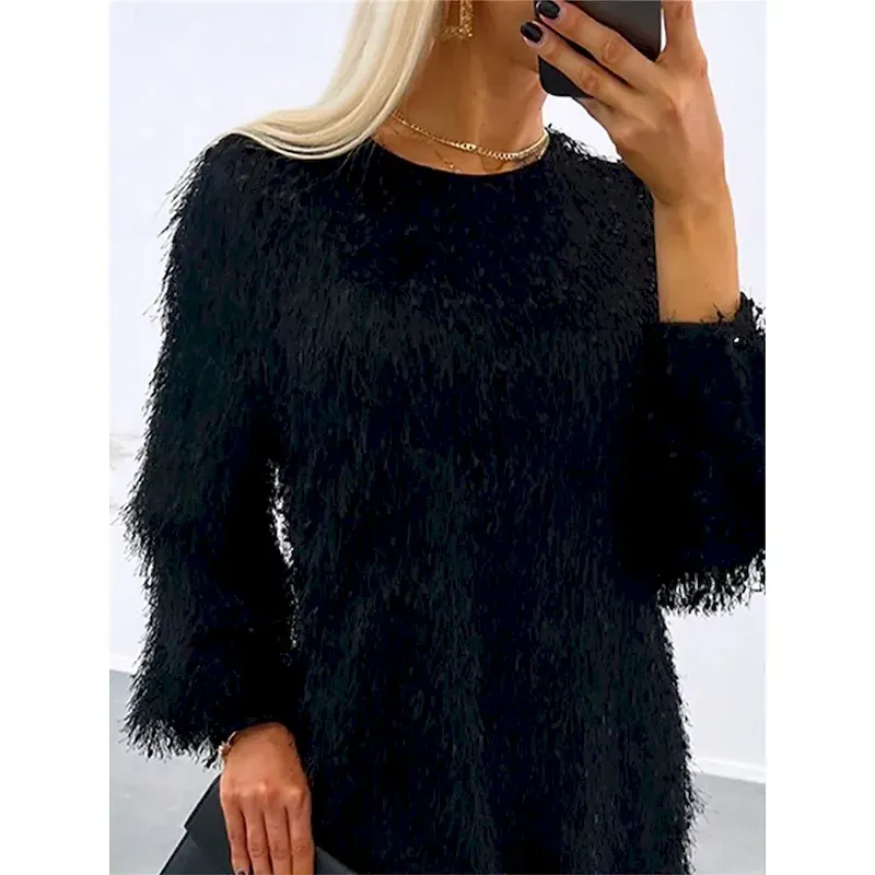[Fabric]: Crafted from high-quality polyester, this women’s dress offers a micro-elastic feel that ensures optimal comfort and flexibility. The plush, textured knit fabric gives the dress a luxurious and cozy appearance, perfect for keeping warm in cooler seasons.[Fit]: Designed with a regular fit, the dress features a loose silhouette that combines style with comfort. Its casual cut makes it an ideal choice for everyday wear, allowing for ease of movement while maintaining a chic look.[Design Highlights]: This mini dress showcases a sophisticated tassel fringe design that adds a playful edge to its overall appearance. The classic crew neck and long sleeves contribute to its voluminous look, enhancing the dress’s eye-catching texture and detail.[Occasions]: Perfect for street styles, sports, and outdoor events, this dress suits a variety of casual occasions. Whether you’re heading out for a relaxed day in the city or enjoying a weekend outdoor adventure, it adds a touch of elegance and sophistication to any setting.[Size Range]: Available in sizes S, M, L, and XL, this dress caters to a broad range of fits, providing versatility and convenience for different body types.OK