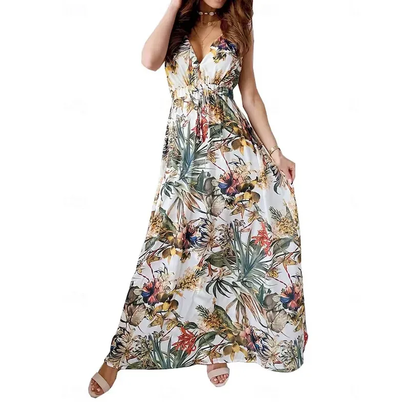 1.Design: Print2.Neckline: V Neck3.Dress Length: Maxi