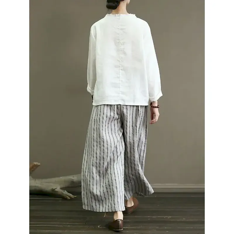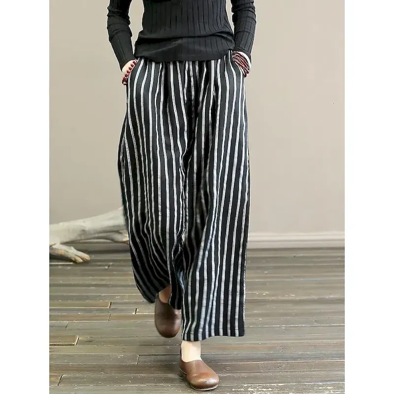 Women’s Wide Leg Chinos Pants Trousers Vintage Fashion Lightweight Full Length Mid Waist Striped Pocket Elastic Waist Baggy Breathability Comfortable Micro-elastic Vacation Casual Daily Black White
