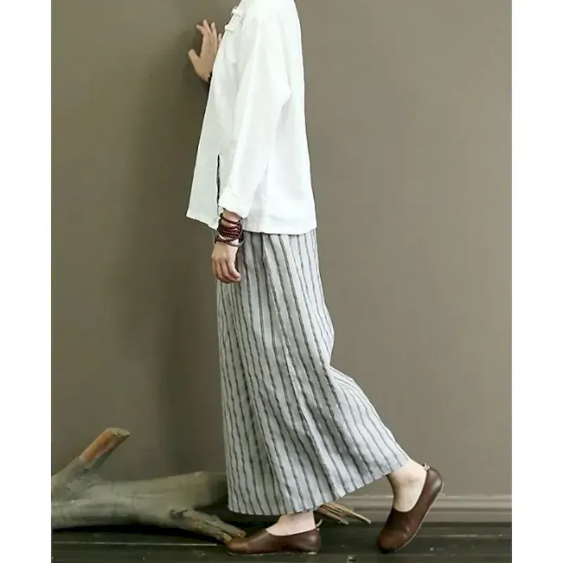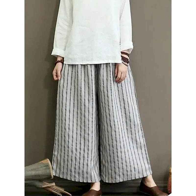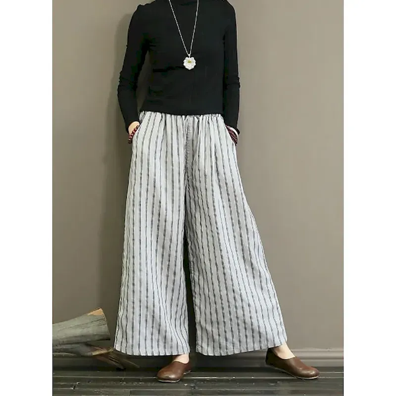 [Design Highlights]: The pants showcase a classic striped pattern in a muted color palette, adding casual elegance to your wardrobe. Functional pockets and an elastic waistband accentuate the practical design elements, making them suitable for everyday wear.