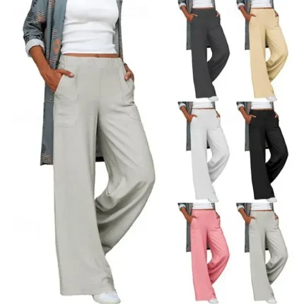 [Fabric]: Crafted from a polyester, cotton, and linen blend, these women’s wide-leg chinos offer a breathable and comfortable feel, perfect for warmer seasons. The lightweight fabric combines durability with a slight crinkle texture, giving these pants an effortlessly chic, vintage-inspired appearance.