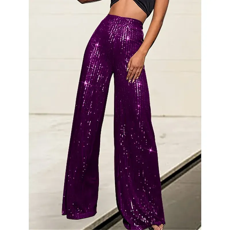 Women’s Wide Leg Pants Trousers Sparkly Pants Elegant Fashion Sparkle Full Length High Waist Plain Sequins Comfy Micro-elastic Party Street Party & Evening claret M beige Pink gold Black Summer Spring