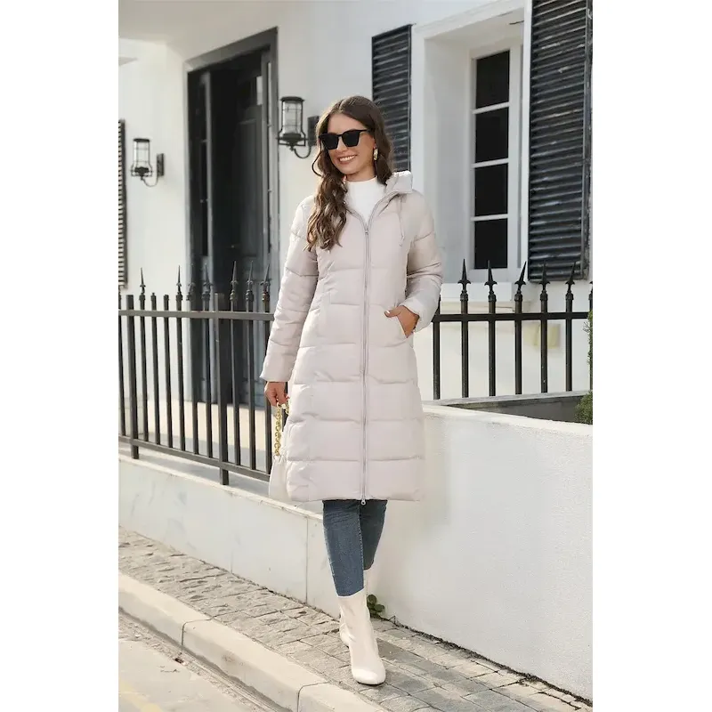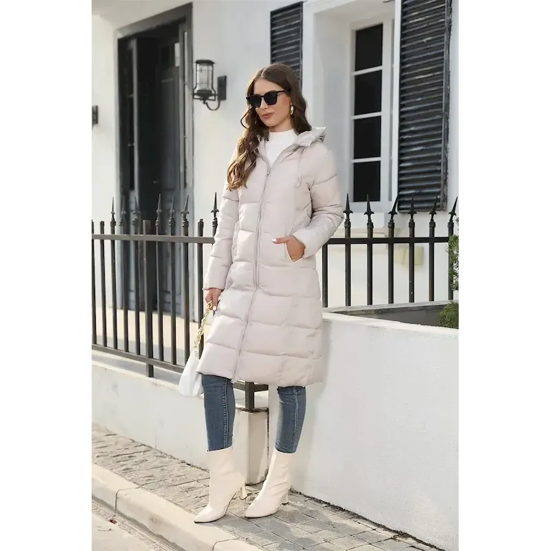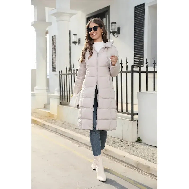 [Fabric] Crafted from high-quality polyester, this women’s puffer jacket offers remarkable durability and resistance to the elements. The quilted, padded design provides excellent insulation, ensuring warmth and comfort even in the coldest weather.[Silhouette] The long silhouette of the jacket delivers a sleek and elegant look, perfect for both casual and formal occasions. Its full-length structure adds extra protection against wind and cold, while the flattering fit enhances your winter style.[Design Highlights] Featuring a functional hood and a full-length visible zipper closure, this jacket combines practicality with modern styling. Side pockets offer space for keeping your hands warm or storing small essentials, adding to the jacket’s convenience.[Occasions] Ideal for a wide range of activities such as fishing, traveling, winter sports, or camping and hiking. Whether you’re exploring outdoors or heading out for a city stroll, this jacket guarantees warmth and style.[Size Range] Available in sizes S through 4XL, catering to a variety of body types. Offered in classic colors including Black, Red, and Khaki, ensuring versatile options to complement your winter wardrobe.